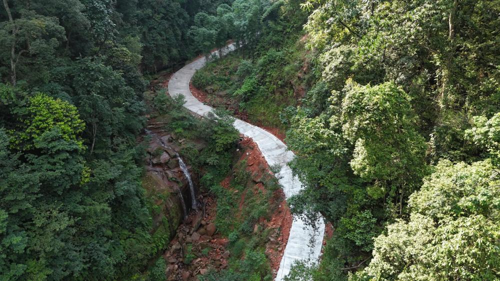 施工现场,十余名工人正紧张有序地开展平场修复作业,部分路段已完成混凝土硬化,平整路面在阳光下泛着青光。“这条路坡陡、弯急,施工难度确实超出预期。”现场施工负责人何生强介绍。面对复杂地形,施工团队采取分段施工、人机配合的方式,科学组织、全力攻坚。自开工以来,工人们抢抓晴好天气推进工程,目前已完成约1公里路面硬化,预计11月底前全面竣工。