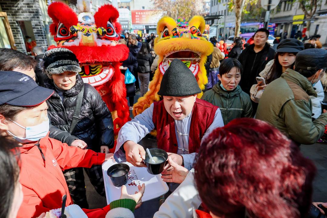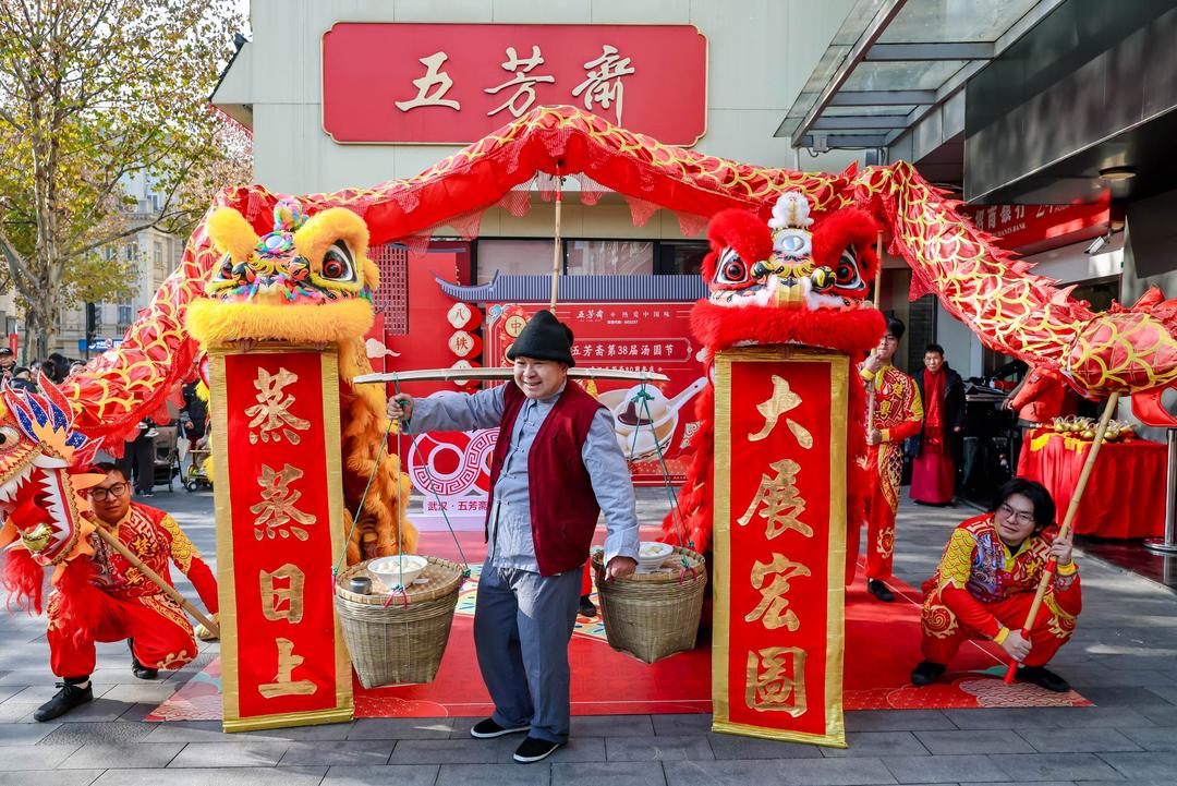 当天,武汉五芳斋总店外的“汤圆铺”热闹非凡。汤圆师傅揭开汤锅盖子,热气裹挟着甜香扑面而来,现场市民争相领取“2026年第一锅汤圆”。拿到汤圆的人纷纷举着碗拍照,分享这份新春头份甜。一场红火热烈的舞龙舞狮正将气氛推向高潮——长龙随着鼓点翻飞腾跃,醒狮摇头摆尾、眨眼腾挪,引来阵阵喝彩。五芳斋负责人与市民代表共同切分大型生日蛋糕,把80周年的甜蜜与福气传递给在场每个人。