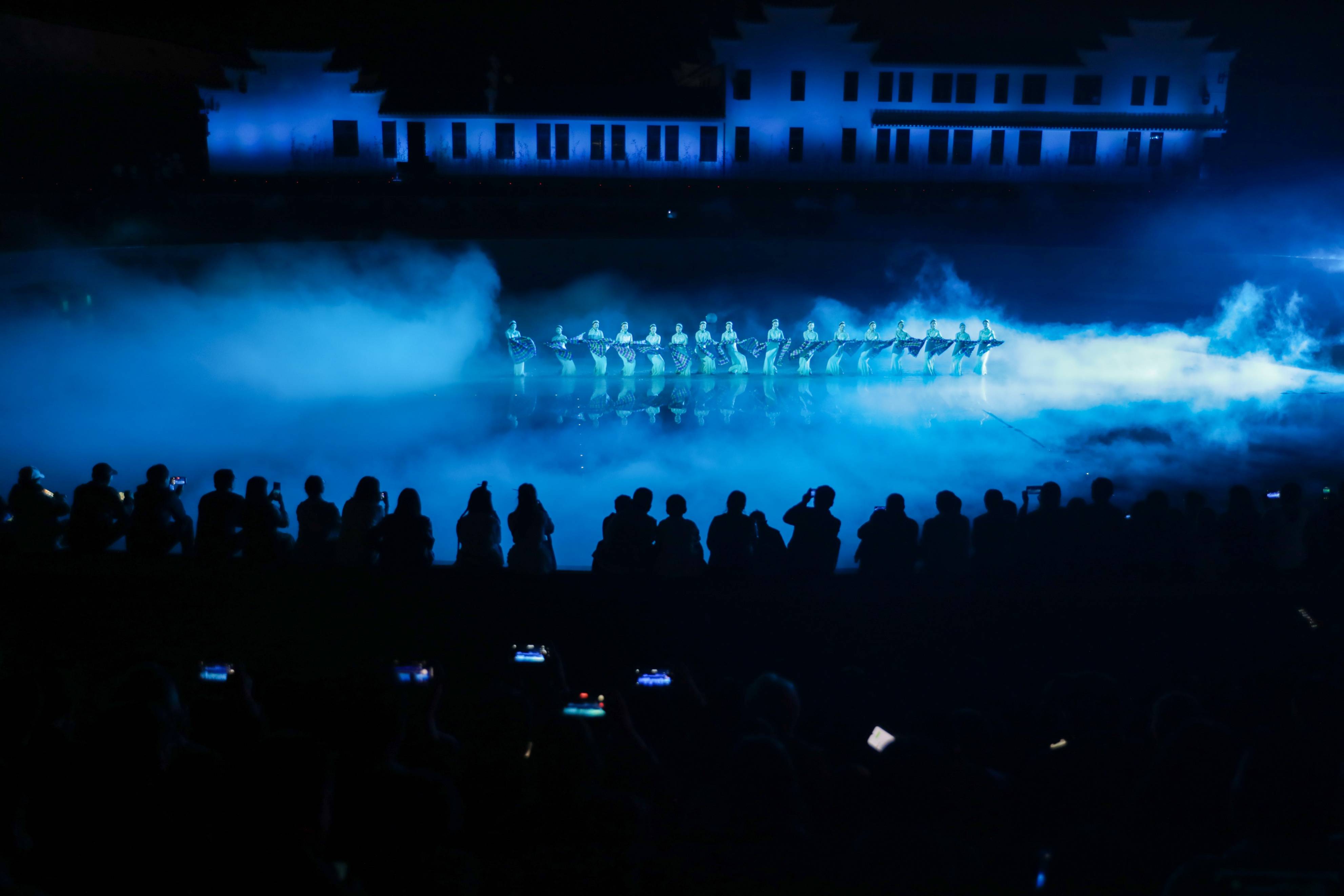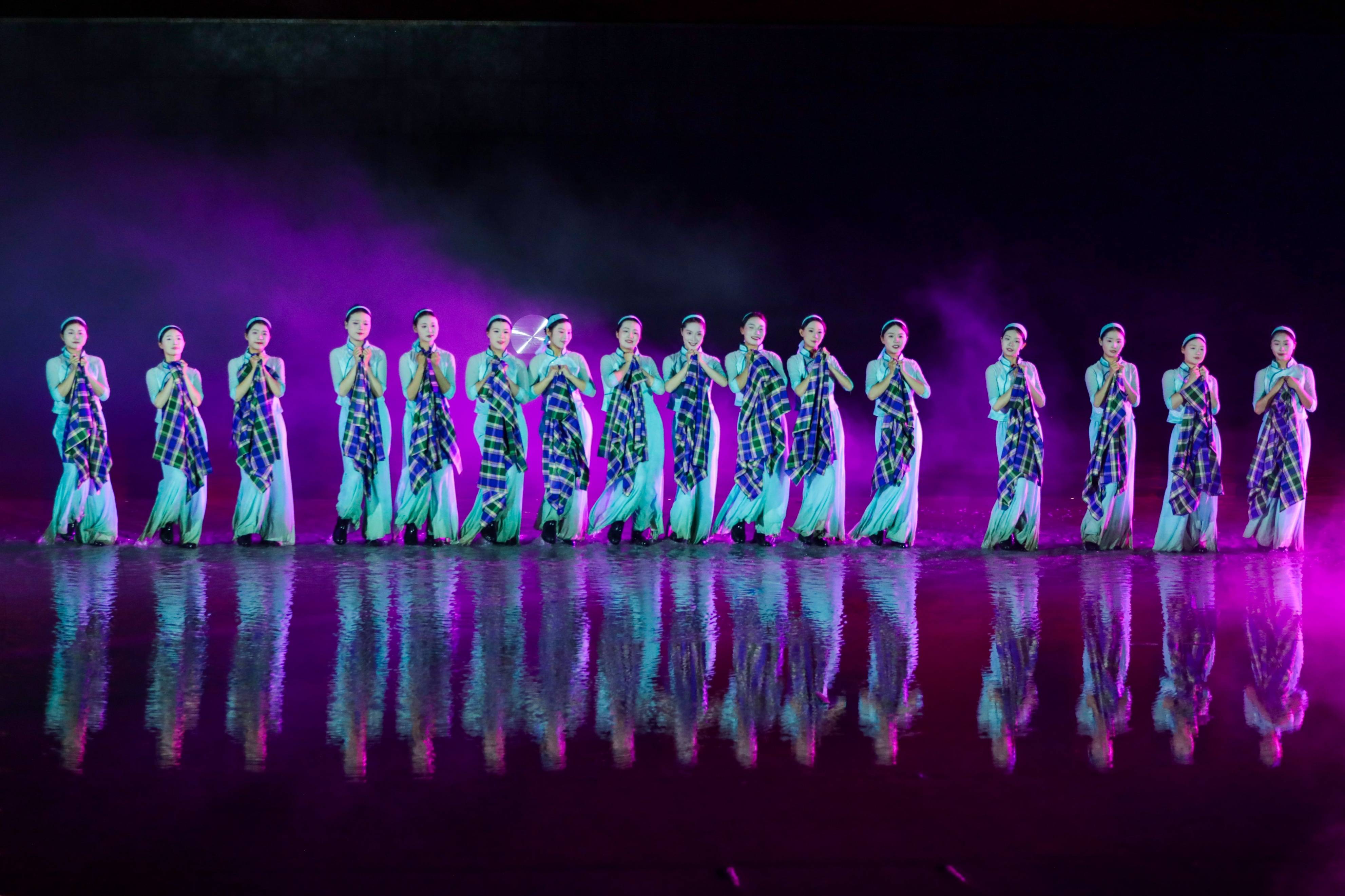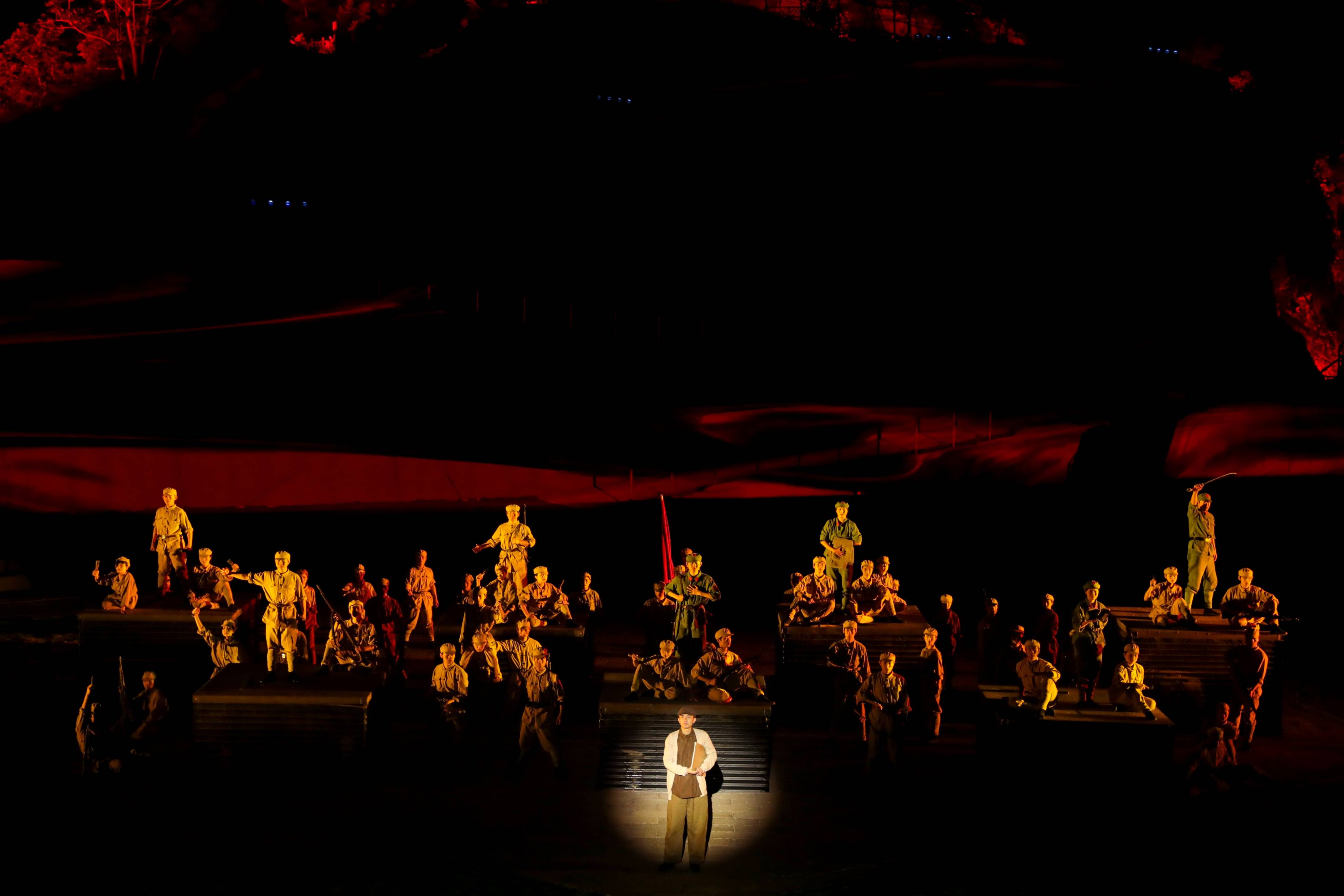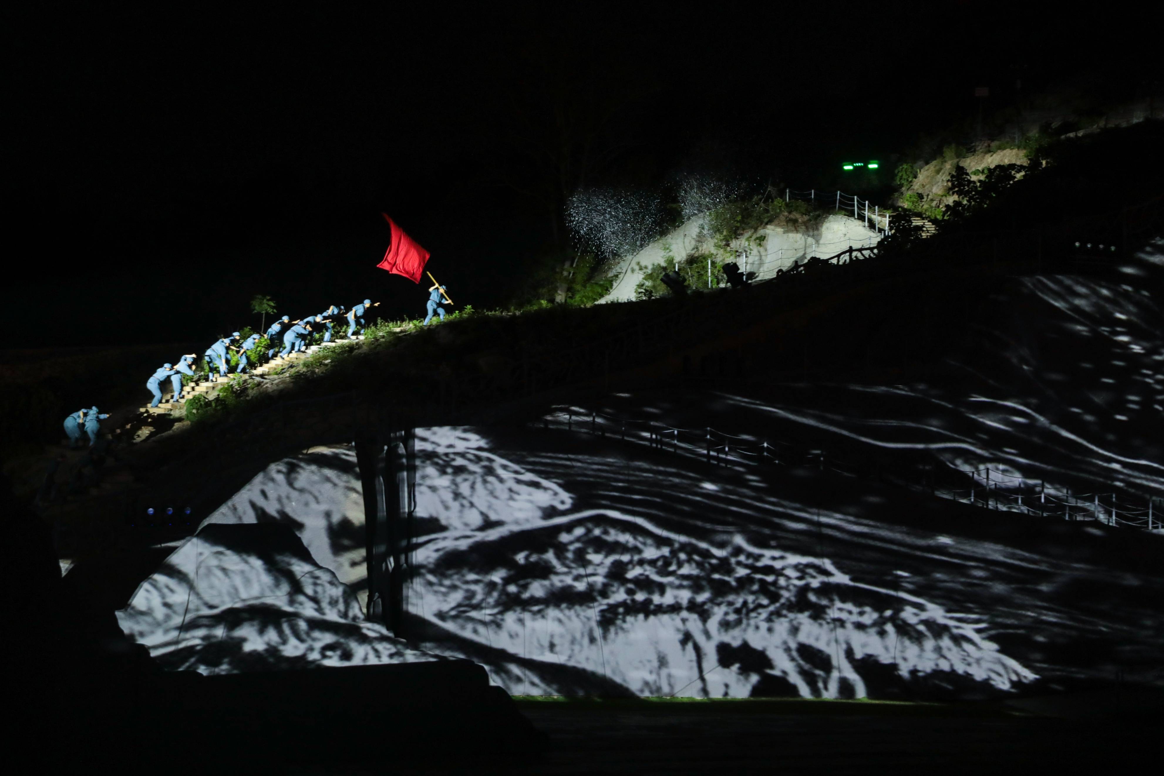 在专业演员的引导下,观众有序从第一幕的水景舞台移步至前门广场、黄安古城内城、月亮湾广场。这种独特的“行浸式”观演模式,打破了传统演出的静态观看方式,让观众成为历史的亲历者,在移步换景中感受革命岁月的波澜壮阔。