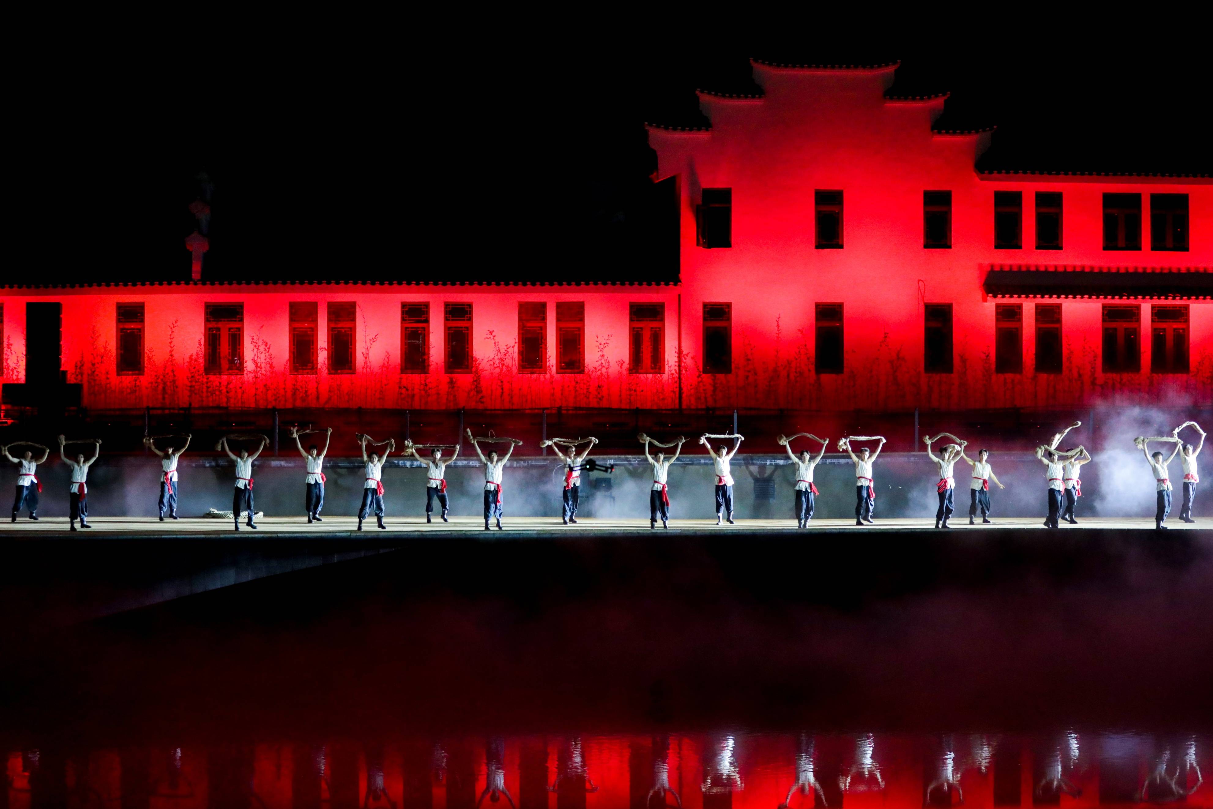 当晚,《红安・红安》行浸式山水实景演出在红安影视幻城上演。7时30分,演出在夜幕中拉开序幕。全场灯光渐次熄灭,随着“红安红安”的水幕落下,水景舞台缓缓点亮。乌篷船载着星火划破水面,“乡亲们”手持火把列队而出,火光映照着他们坚毅的身影,为观众点亮了前行的方向。