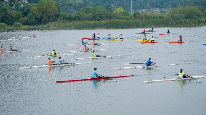 图说:宜春市少年体校的学生们正在进行赛艇和皮划艇训练