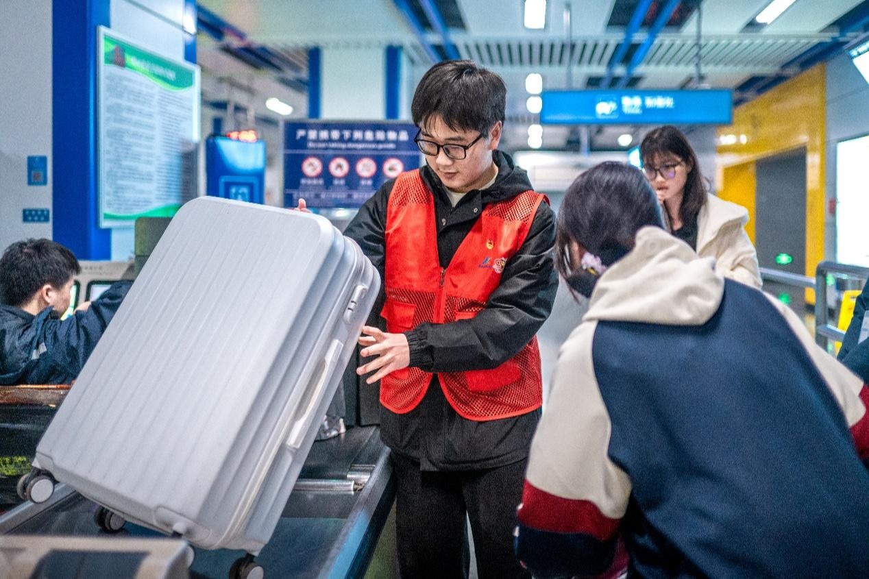 “红马甲”志愿者帮助乘客搬运行李(黄俊宇 摄)